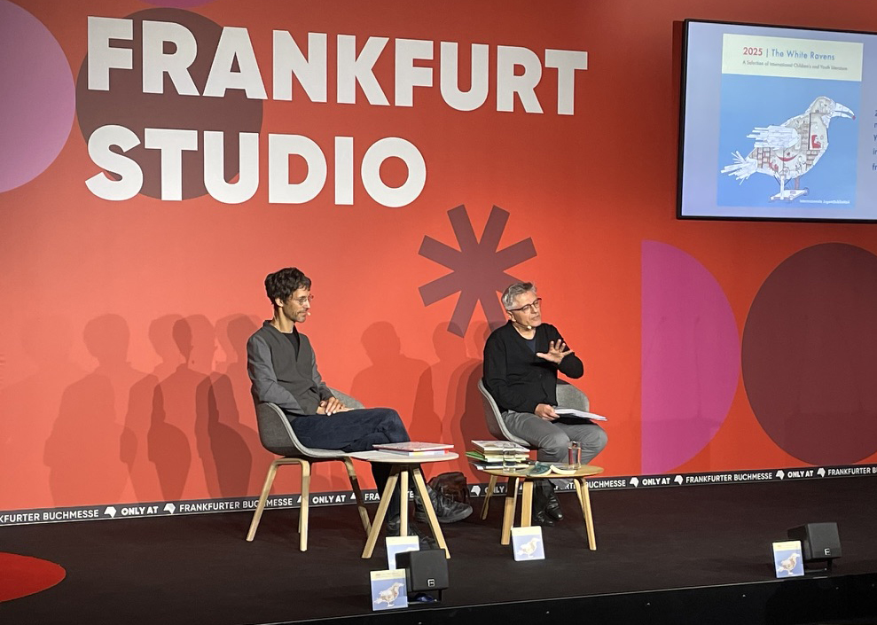 Oliver Ilan Schulz and Jochen Weber from the International Youth Library Foundation in Munich present the 2025 White Ravens List at the Frankfurt Book Fair. |